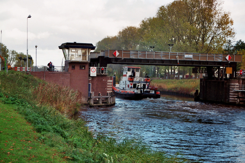 Lopend langs het Van Starkenborghkanaal NZ richting Koopman kijk ik naar een immense bak met bulten grond, voortgedreven door een hooggebouwde duwboot. Knipwerk op een presenteerblaadje…. Ik zie twee opvarenden bij de opbouw naar boven klimmen, ze slaan de handen om de randen van het dak. De snelheid vermindert, de bak drijft onder de geopende brug door. Zou de duwboot…? Centimeterwerk.