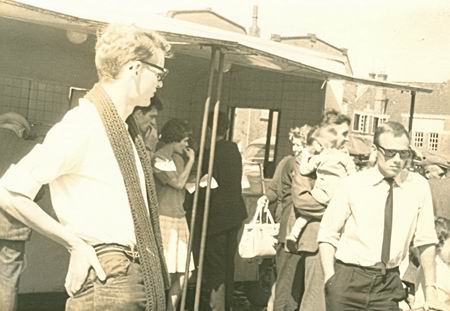 foto SJGW-marktkraam markt Winschoten; Albert Steendam en Jan Blaauw als standhouders, waarschijnlijk 1964 of 1965