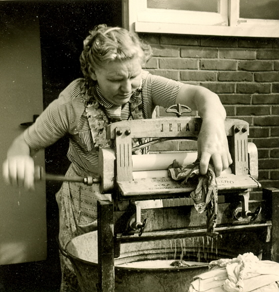 Prachtig tijdsbeeld, vijftiger jaren vorige eeuw. Moe Blaauw maakt de was droger door middel van de wringer, een nieuw hulpmiddel dat het werk gemakkelijker en gezonder maakt. Deze foto werd genomen in Midwolda achter het huis aan de Niesoordlaan, nummer 59, waar we woonden van 1953 tot 1967. Als kind vond ik de wringer op de houten bok een prachtuitvinding. Graag hielp ik mijn moeder, tenminste als ik mocht draaien. (MichieldeRuytersyndroom?) Eerst al het klaarzetten, de bok uitklappen en vastzetten met de haakjes. Dan de wringer op de juiste stand en hopen dat er niet te veel overalls of "stuutsiekorenboksems" bij de was zaten…. Later, als we terugkwamen van het zwembad in Scheemda, zelf de zwembroek en handdoek een waterbeurt geven en dan door de wringer. Al gauw verloor dit apparaat zijn faam, de centrifuge deed zijn intrede, in sommige gezinnen gevolgd door de wasdroger, voorzien van energielabels. De wasteilen of "wasketobben" belandden als bloembakken in de tuin of als overtolligheid op rommelmarkten of in kringloopwinkels. Wringers worden nu nog wel gebruikt in het onderwijs bij creatieve vakken. Tijden veranderen.