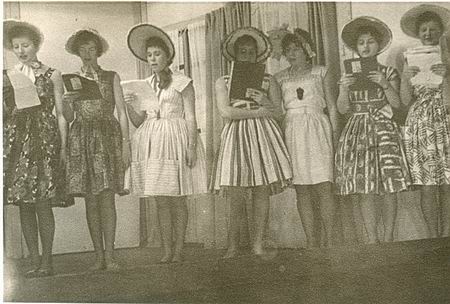 Deed me meteen denken aan een helaas iets minder heldere foto, ook afkomstig van de VUS-feestavond (plm.1960) in de grote zaal van hotel "’t Hoen" in Scheemda. Van die avond liet ik al eerder enkele toneelfoto’s zien. Hier een rijtje zingende nachtegalen, fraai uitgedost, vrouwelijk schoon uit de ULO-jaren, eind jaren vijftig, begin jaren zestig. Ongetwijfeld heeft de zaal niet alleen van de muzikale klanken genoten, maar verlustigden velen, met name de "mannelijke" pubers, zich aan het uiterlijk vertoon: "Mooie benen, mooie benen…."