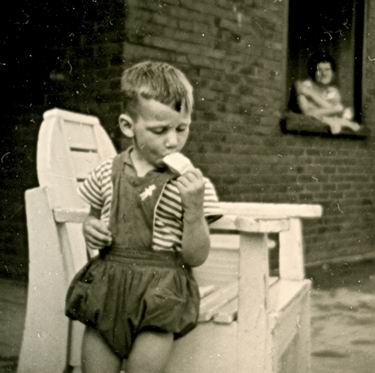 De onverstoorbare Carla. En haar likkebaardende broertje Alfred, genietend, volop, van een ijsje, toen minder gewoon dan nu. Op de achtergrond trouwens "vrouw Lindeman", die de "vestiaire" beheerde. Bij haar haalde je een haak met een genummerd polsbandje en leverde daar vervolgens de volgehangen haak weer in. (Nou ja, meestal…..) Als je dan uiteindelijk naar huis moest, leverde je het bandje met nummer bij haar weer in en kreeg je je kleren terug. Voor vrouw Lindeman actief werd in het zwembad, bleven de kleren in het, soms overvolle, badhokje hangen en wilde het wel eens gebeuren dat je iets miste (ook al had je je portemonnee+horloge bij vrouw Schuur afgegeven).