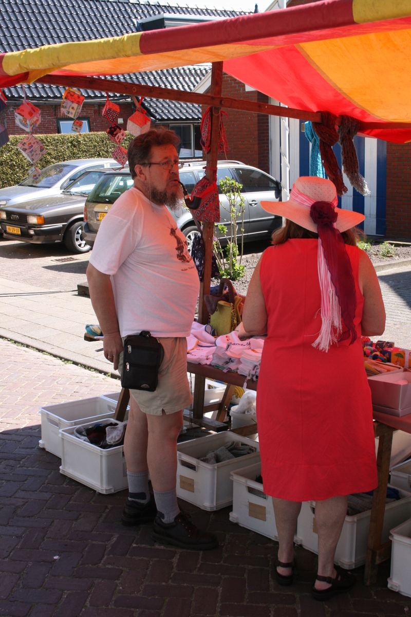 Niet alleen de kooplust is belangrijk, ook de sfeer van hernieuwd contact, een praatje, een schimpscheut…… "Hé, bist der ok? Heurt jim niet tussen de oldtimers???" De stamgasten van de "Dorpsbelangenkroeg" zitten breeduit bedaagd hun glazen te legen, af en toe klinkt er gelach. De ijscovrouw komt soms handen tekort, de exploitant van de kinderdraaimolen laat met lede ogen zijnattractie draaien, léég…. Klaas en Hanna van het rijwielhuis zijn druk met hun nering, Jikky heeft tijd om eigen taille te meten, Ellen staat stralend in haar schoonheidskraam: ’t is immers gauw Moederdag!