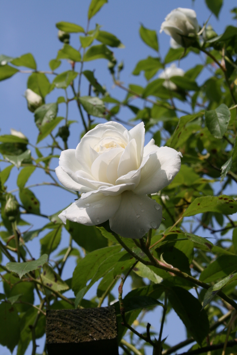 (Dat gevoel heb ik geëerfd van mijn vader). In dit geval een klimroos, die rijkelijk bloeit ondanks een wat kommervol bestaan (bladafval, vlekjes op de blaadjes etc.) Zo’n bloem? Voor mij het summum van schoonheid, dáár word ik stil van!