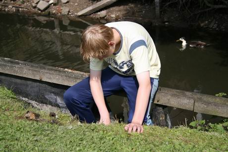Je hebt zomervakantie en je wilt wat. Maar wat? De stemming is landerig, het is zo’n middag waarop je je verveelt, of eigenlijk ook weer niet. Aangenaam zomerweer. Nou ja, te warm om je al te druk te maken en van de familie hoef je het ook even niet te hebben…. Het liefst even in je eentje "aanklooien", aan de rand van het hertenkamp (Noordhorn), nabij de oostgracht. Een gat bij de beschoeiing, grond iets verzakt. Zou daar…. Schepje erbij, je haalt altijd wat uit de modder (al is het niet uit de tijd van de borg Noordwyck). Grond er wat af peuteren, zou het iets van waarde zijn? (foto’s xa9janblaauw, 30 juni 2008)