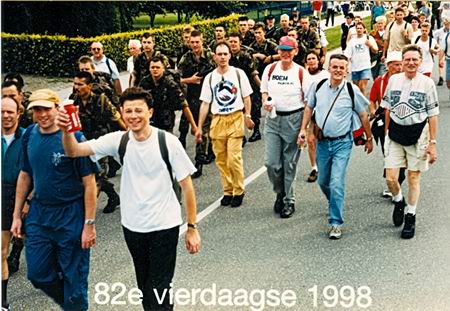 Vandaag eerst wat regen op weg naar het station van Wijchen, een goede waarschuwing niet te lichtzinnig met de weergoden om te springen… Alle bekenden zijn er weer, op het station, gelukkig. Jakob is vrij snel na mij bij "De Vereeniging", meteen naar de start en vlot "weggeknipt" (8 voor 5 uur). Niet koud, niet nat, maar toch eerst wat vochtig weer dat na het licht worden overgaat in een strak blauwe lucht. We hebben, na het saaie eerste uur, de koffie dan al genoten in "Harten Twee"en vijf kwartier later in Overasselt, bekende plekken. Dan binnendoor naar Grave, over de befaamde brug die opgeknapt wordt, door het sfeervolle stadje, rusten in het voormalige klooster. Een prettige stop, vele wandelaars willen déze rust blijkbaar niet… Inmiddels begint het linkerbeen wat pijnlijker te worden, lichte scheenbeenproblemen. In Beers is het weer volop "kermis": tomatensoep + een Papendrechtse polonaise + ‘Sex on the Beach’. Verder naar Cuyk, binnendoor tegenwoordig via Vianen, een glas melk onder de bomen. En dan zijn er toch weer die buikkrampen, die darmstoornissen waar ik al eerder bang voor was. Door de geweldige drukte in Cuyk, dan de duikerbrug over en daarna door het ook al immens drukke Mook en Molenhoek naar Malden, waar we even van de weg afgaan naar "Petit Malden", een lunchroom van naam: uitgesteld verjaardagsgebak en heerlijke koffie! (Maar het ging vooral ook om de toiletten….) En dan de intocht, de laatste kilometers, ontieglijk druk en eigenlijk niet echt iets voor mij. Om kwart voor 4 kom ik met Meilo bij de finish, Jakob is in het laatste gedeelte plotseling verdwenen. Snel naar de WC, o jee, nauwelijks mogelijk in die chaos bij ‘De Vereeniging’. Na terugkomst geen Meilo en geen Jakob….. NUmmertje 12 gehaald + "De Gelderlander" en toen maar gauw: wégwezen! Nou ja, gauw…. Het is een belachelijke kluwen mensen, waaraan geen touw is vast te knopen. Waar wil iedereen eigenlijk heen??? Voor de trap over de Annastraat staat alles muurvast. Ik ga toch maar weer óm, dan "snel" naar het Nijmeegse station. Dáár is het gelukkig wel heel gezellig!"