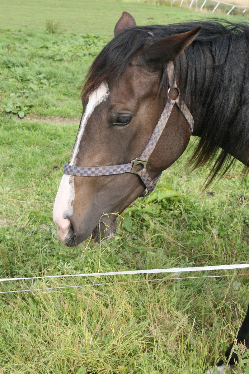 Of dit paard in het weiland bij het nieuwe huis van Zwama’s aan de Meidoornstraat in Noordhorn. Nieuwsgierig kijkend wat die kieker uitspookt, maar ondertussen doorgaand met het consumeren van vers groen. Kenmerkende bles, oren gespitst.
