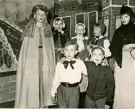 Vanzelfsprekend stond de oude sage van "Het Vrouwtje van Stavoren" centraal in het script van meester Zonderman. Dat verhaal had echter geen body genoeg om avondvullend te zijn, vandaar dat meester er aanvullende sketchjes bij bedacht die te maken hadden met de ‘tijd van toen’…. Overigens werd er heel veel zorg besteed aan de kleding en het schminken. Daarbij, dat schiet me net te binnen, zal ook zonder twijfel mevr.Kampstra een rol hebben gespeeld. Dochter Tineke, ook een klasgenoot, wás de ‘Vrouwe van Stavoren’, een talent! Een deel van de ‘tableau de la troupe’ gefotografeerd: