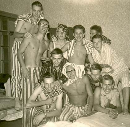 De namen van deze uiteenlopend, maar overwegend goed gebouwde "hoop der onderwijsnatie"? Bovenste rij van links naar rechts: Geert van Duinen (overl.), Henk Pras, Frans Scheuneman ? , Piet Hilberdink, Fokko Roelfsema, Appie Koster; midden: Eelko Brader (ook overl.); onder: Eppo Jager, Henk van Dijk, Roelof Geerts, Roelf Lamein. "Helden" uit een herlevend verleden, ruim 40 jaar geleden….