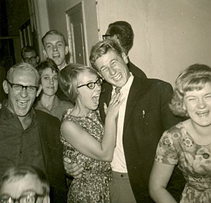 De eerste werkweek in het land van het bronsgroen eikenhout die ik meemaakte als Winschoter kwekeling, was ongetwijfeld ook de week van de gulle lach. Nee, ik zeg beslist nixc3xa9t dat er nixc3xa9t gewerkt is…, maar gelachen hebben we zeker. Dat heeft vooral ook te maken met de samenstelling van de groep. In het ene jaar zitten er nu eenmaal meer kurendrievers bij dan in het volgende. Neem nou iemand als Roelf Koning, aan wie ik vele dierbare herinneringen bewaar. Zijn vroegtijdige dood, enkele jaren geleden, schokte me, en mij niet alleen. Niet alleen de kweekschooltijd leverde een schat aan herinneringen, ook het feit dat we beiden schoolsucces afwisselden met een ‘minne’ periode. Later kwamen we elkaar op onregelmatige momenten tegen, vooral door vakbondsactiviteiten. Ook op de promotiereceptie van Henk van Dijk, toen er eveneens vele gebeurtenissen de revue passeerden en vaak aanleiding vormden tot een beroep op de lachspieren. Die lachspieren hadden het tijdens de werkweek in Zuid-Limburg bijzonder druk, onder andere op de laatste avond toen Roelf Koning een van de gangmakers was tijdens het bonte programma. (Zie foto 1) Op de foto tevens Geert van Duinen als ‘aangever’. Ook hij is jammer genoeg veel te vroeg overleden.