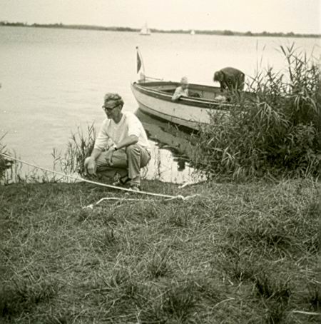 In de jaren zestig ben ik, en dat heb ik al eerder aangestipt, als assistent aan het werk geweest in jeugdherberg ‘Oer ’t Hout’ in Grouw, dat nu Grou heet. Er was toen nog nauwelijks sprake van een nieuwe accomodatie, al zat het oude, witte gebouw in het centrum in het seizoen altijd overvol. Drie zomers heb ik geholpen, één jaar ook in de Paas- en Pinkstervakantie. Soms konden we er even tussenuit met jeugdherbergvader Kees de Weerd, met de eigen boot (op de achtergrond, met een van de kinderen De Weerd, vermoedelijk Marcel. Of is het toch Erwin?). Zelf poseer ik aan de waterkant, waarschijnlijk heeft collega Sam Orsel mij op de kiek gezet. Toen nog een bril met een opvallende, donkere rand, en een ‘slag’ in het haar….. Het lijkt heel wat, maar actief op het water? Nee, dat ben ik nauwelijks geweest. Op je vrije dag mocht je (gratis) meevaren met een cursuszeilboot, maar daarvan heb ik nooit gebruik gemaakt. Ik ging liever naar Leeuwarden City, op speurtocht naar bijzondere boeken en grammofoonplaten. Zeilen heb ik dus ook nooit geleerd, op de in gebruik zijnde BM’ers, 16xb2. Maar verveeld heb ik me ook geen moment…