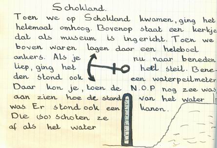 heel hoog was. Dan moesten de mensen naar het kerkje komen, die op het hoogste punt ligt. Toen we in het kerkje kwamen, zagen we allemaal oude dingen, zoals een dijbeen van een mammoet. Alles was in chronologische volgorde opgesteld.Schokland  Er waren ook stenen doodksten. Die kwamen van de Wieringermeerpolder, waar ze gevonden zijn. Die stonden in het midden. Er was ook een kaak van een walvis. Er was een meneer die er ons alles van vertelde. Ook stukken van schepen waren er. Daar zijn ook borden uitgekomen. Er waren ook een paar waar een spreuk op stond. Toen we naar buiten gingen, kwamen we bij hele dikke palen. Als je naar beneden keek, zag je het land, dat vroeger de zuiderzeebodem was. Er moesten nog een paar naar de W.C. en toen gingen we weer naar de bus. Daar hebben we nog een glaasje ranja gehad. Toen zijn we weer in de bus gestapt en weer weggereden.