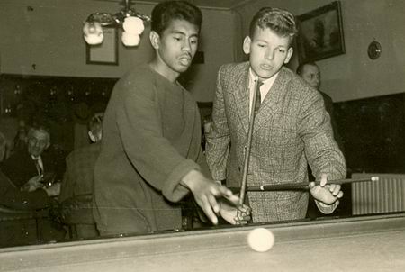 Een bijzondere foto uit de jaren zestig, gemaakt in Scheemda. Waarschijnlijk in het toenmalige café Kraster aan de Diepswal, toen ook min of meer het clubcafé van de voetbalvereniging Scheemda. Op de foto links Rob Nanuru, ULO-scholier. Rob verbleef in die Scheemder jaren bij de familie Huiberts, ik dacht aan de Parklaan. Rob is in deze situatie blijkbaar de meer ervaren speler, hij geeft aanwijzingen aan mijn 2 jaar oudere broer Hemmo, toen geen onbekende in het Scheemter uitgaansleven….