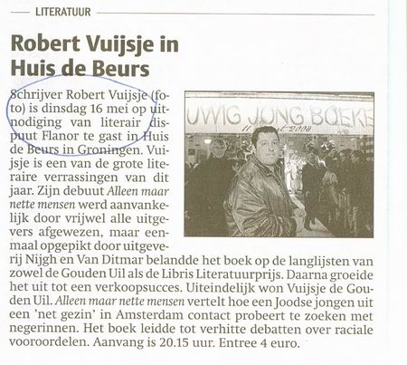 De eindredacteur van de KUNSTpagina (26) in het Dagblad van het Noorden van vandaag, vrijdag 12 juni, zal wel even zijn wenkbrauwen hebben gefronst, of achter zijn oren hebben gekrabd…. Staat er dat schrijver Robert Vuijsje dinsdag 16 mei op uitnodiging van Flanor te gast zal zijn in Huis de Beurs in Groningen. Dinsdag 16 mei…. Tja, dat duurt dus nog even….