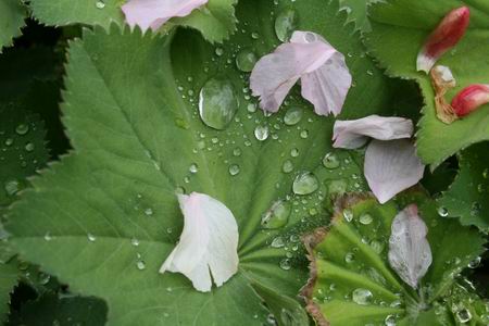 Juist die regendruppels lijken wat extra's te geven, in combinatie met de kroonblaadjes van de Japanse kers, geland op deze breedbladerige plant…