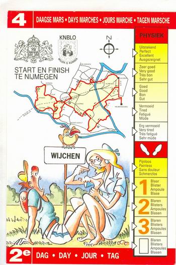 Het blijft een vreemde zaak voor mij, dezer dagen…. Ik ben meer in het Rijk van Nijmegen dan in mijn woonplaats Noordhorn, hoewel ik gewoon thuis ben en slechts in gedachten meeloop. Gisteren gebeurde dat al tijdens die warme eerste dag van Elst, vandaag is het niet anders op die nauwelijks minder warme dag van Wijchen. Ik kom nog steeds niet los van die vierdaagse wandelhappening, ook al heb ik daar sinds 2004 nog nauwelijks een voet gezet. In 1987 liep ik mijn eerste Nijmeegse Vierdaagse, redelijk goed voorbereid, al wist ik nauwelijks wat me stond te wachten. Ik kende het gebied niet, de routes evenmin, je moest uitvinden waar je het beste kon pauzeren, etcetera. Ik was destijds in goede wandelconditie, zodat ik telkens vlot binnenkwam. De derde dag zelfs al om half twaalf in het bekende FLAL-tempo, grotendeels meegewandeld met een dóórlopende Fin… Dat ik toen echt genoot, kan ik niet zeggen. Later werd dat anders. Je liep meer met collega-wandelaars, het werd socialer, je wist waar je langs kwam, je overzag het beter. Tot en met 2003 ging het goed (al liep ik in 2002 niet vanwege het overlijden van mijn moeder), in 2004 werd het een desastreuze Driédaagse. Ik moest na een pijnlijke derde dag afhaken met een ernstige blaasontsteking. Koorts, kon niet of nauwelijks meer plassen, over en uit. In 2005 ging deelname door persoonlijke omstandigheden op het laatste moment niet door. Daarna heb ik de pijp aan Maarten gegeven wat het wandelen betreft (al zei ik er meteen bij: Zeg nooit 'nooit'….)