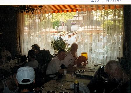 Verdiende pauze tijdens de eerste wandeldag in het Wapen van Elst, samen met Jacob Klompien. Met hem heb ik vele Vierdaagsen en andere wandeltochten gelopen. In 2003 onze laatste gezamenlijke Nijmeegse Vierdaagse. Jacob werd niet lang daarna (opnieuw) ernstig ziek, belandde in het ziekenhuis en overleed begin november aan kanker. Een onvoorstelbaar verlies, vooral voor zijn vrouw Joke en dochter Esther. In 2004 miste ik hem natuurlijk, zeker ook in Nijmegen en eigenlijk "komt Jacob nog regelmatig langs". Onmisbare herinneringen!