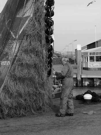 Vroeger moest je in zwart-wit fotograferen, kon je de kleuren fantaseren… Tegenwoordig kun je in kleur kieken, maar kun je het toestel zo instellen dat het zwart-wit lijkt…. Accent op de bezigheid van de netten verzorgende visser in Oudeschild.