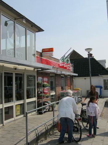 Weg oversteken, rechtsaf op het fietspad richting brug over het Van Starkenborghkanaal. Zinderende warmte, weinig lawaai in de lucht, meestal alleen van voortrazende landbouwtractoren. Brug over, winkelstraat in en ja, daar links is "De Spar" mxc3xa9t het postagentschap!