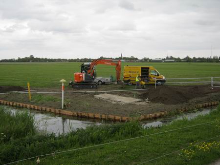Aan de noordzijde van de Mokkenburgweg wordt door een werknemer van "Hummel Totaal" gewerkt aan weilandbehoud en een verbeterde waterafvoer.