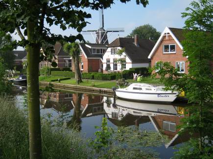 Dorpsbeeld van Enumatil, opnieuw met weerspiegeling in het water van het Hoendiep! De uitbundig bloeiende bermen vormen een rijk bezit met vele plantenvarixc3xabteiten.