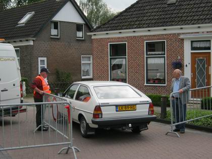 Zonder vrijwilligers is een evenement als dit niet te organiseren. Denk bijvoorbeeld maar aan de verkeersregelaars, de Dorpsbelangenmedewerkers, de meerijders in de koerswagens en op de motor, de broodjesbezorgers etc. Als lichtend voorbeeld hier Jan Geertsema, in het oranje hesje van de verkeersregelaar. Hij laat nog even een late automobilist l