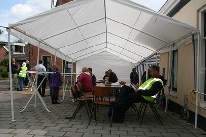 Bij een sportief evenement als een wielerronde gaat er nog wel eens wat mis, een ongeluk zit in een klein hoekje. Goed dat er dan EHBO'ers beschikbaar zijn! In dit geval twee leden van de EHBO-afdeling Aduard, klasse! (Hier op de voorgrond in de cateringtent van Dorpsbelangen Noordhorn)