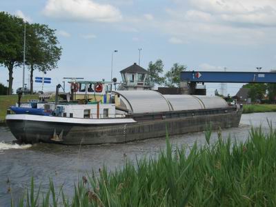 Foto, genomen bij de verkeersbrug tussen Noord- en Zuidhorn. Vrachtvervoer xc3xa9n pleziervaart!