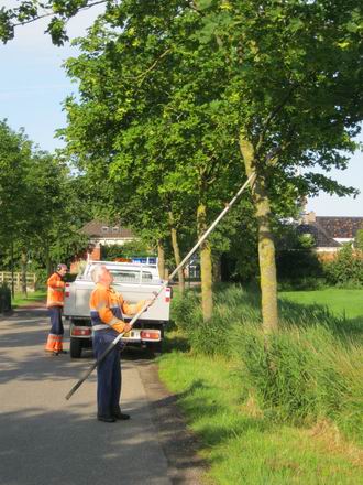 Even de paarden bewonderen, die op hun beurt meer aandacht voor hun ontbijt hebben dan voor een toevallige vroegpasseerder. Door Den Horn lopend merk je nog weinig van de wakkere bevolking. Aan de oostkant komen de oranjegehemde gemeentewerkers van de Aduard-ploeg groenmaatregelen nemen.