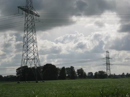Het water van De Lindt met weerspiegeling; de hoogspanningkabels en staanders imponeren het beeld.