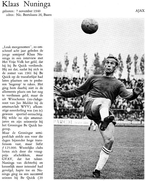 Een van mijn voetbalhelden in de jaren zestig werd de Winschoter Klaas Nuninga. Toen ik op de Winschoter Rijkskweekschool kwam, zat Klaas Nuninga in een van de hogere leerjaren. Toen hij als 16-/17-jarige zijn opwachting maakte in het eerste elftal van W.V.V. (toen nog op het sportterrein in de bomenbuurt), ging ik speciaal voor hem naar het sportpark in Sodom. (Tot verdriet van mijn vader die een bloedhekel had aan die “aigenwieze” Winschoters…) Via Be Quick en GVAV kwam Nuninga uiteindelijk bij Ajax terecht en ook daar was hij een van de redenen dat mijn voorkeur verschoof van Utrecht naar Amsterdam. (Later versterkt door prima Winschoter voetballers als Jan Mulder en Arie Haan).