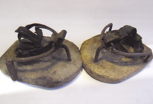 Foto uit “Duvekoater” 51 met voorwerpen uit het veen, in dit geval geschonken aan de collectie van de boerderij Hermans Dijkstra door de familie Levering. “Houten plateaus die onder de paardenhoeven werden bevestigd om te voorkomen dat de dieren in de zompige veengrond zouden wegzakken.”