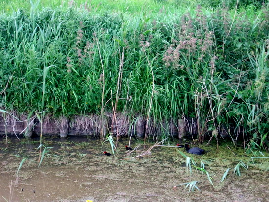 Jonge meerkoeten in de sloot langs de Mokkenburgweg, richting boerderij De Jong. In de dagen daarna niet weer gezien. Elders een veilig heenkomen gezocht?