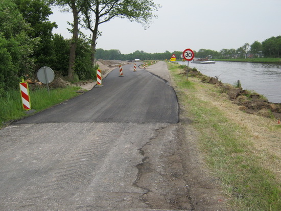 Vanaf de Mokkenburgweg linksaf terug langs het kanaal richting Noordhorn. Het nieuwe tracé, meer landinwaarts, is geasfalteerd! (Er komt nog een slijtlaag bovenop t.z.t., aldus Sjabbo Datema). Nog niet geopend, het toegestane verkeer (langzaam….) wordt nog over oude gedeelte langs het water geleid. Twee dagen later is het anders….