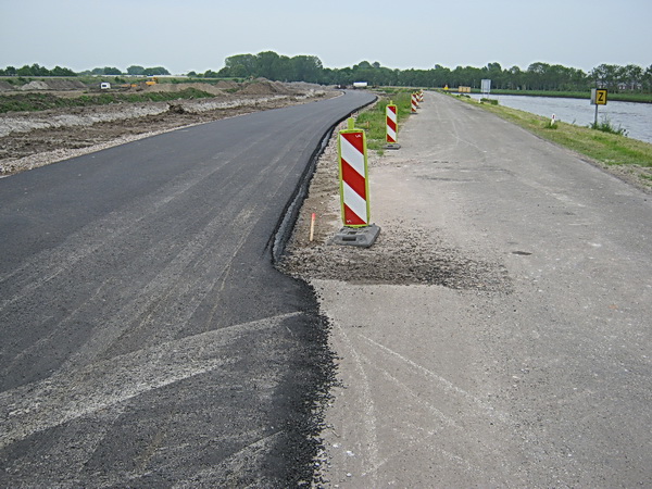 Zo te zien is er al flink over de nieuwe asfaltlaag gereden… Ik ga toch maar over de oude weg, dichter bij het water… Vertrouwder, er is ook meer te zien!