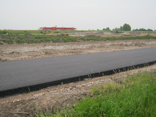 De nieuwe weg met een dikke laag asfalt! Op de achtergrond, op de oude spoorbaan, de Arrivatrein tussen Groningen en Leeuwarden… Of: tussen Zuidhorn en Grijpskerk….