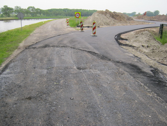 Het begin/einde direct ten westen van de spoorbrug. Dit moet nog worden afgewerkt. Een lastige bocht voor hardrijders….