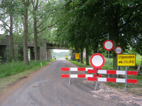 Twee keer een verbodsbord (verboden in te rijden in beide richtingen) lijkt tamelijk overdreven…. Tractoren, fietsers en brommers mogen er wel langs, maar niet als ze zwaarder zijn dan 5,4 t….. En niet harder rijden dan 30 km per uur. (Dat bord staat hier niet, maar verderop dubbel…)