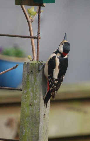 De nieuwe bonte gast wordt niet bijster vriendelijk welkom geheten door een merel…. (Kwestie van oudste rechten?)