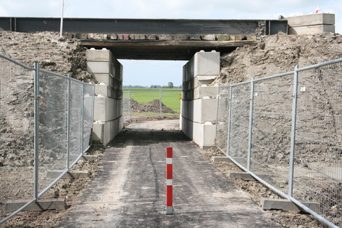Zaterdag 29 juni, weekend. Geen werkzaamheden in het dorp zelf, dan maar eens kijken of “ze” bij het kanaal iets zijn opgeschoten. Uiteindelijk zijn de werkzaamheden afgelopen donderdagmorgen officieel geopend door een drietal hoogwaardigheidsbekleders en dat moet dan toch wel stimulerend werken. Aan het begin van het dorp, bij Langestraat Zuid, staat overigens nog steeds een GMB-bord (“Ervaar de zekerheid”) dat genodigden en andere belangstellenden de weg wijst naar de opening…. Dat lijkt me na drie dagen toch wel enigszins achterhaald, die GMB-zekerheid moet je dus ook met een korreltje zout nemen…