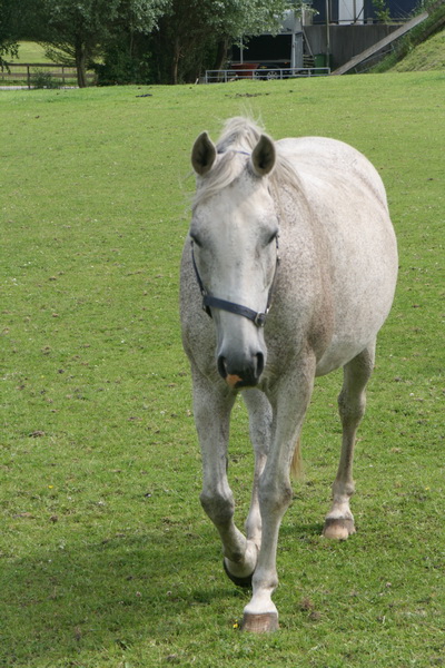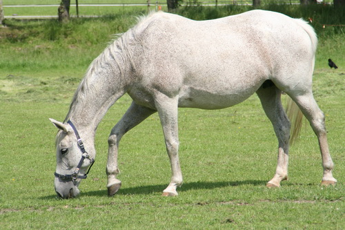 De grijze merrie komt vaak eerst even kennismaken met de fotograaf; ze wil weten wat voor vlees ze in de kuip heeft….