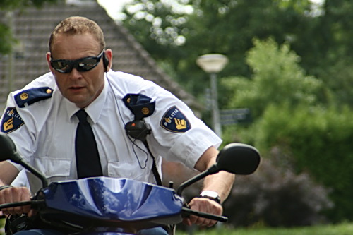 Ook de wijkpolitie komt een kijkje nemen, op de brommer, rustig rijdend, maar wel in coureurshouding…..
