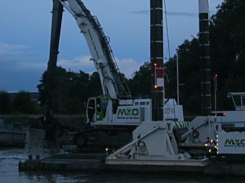Er is blijkbaar haast geboden bij het baggerwerk, dat nu aan de oostkant van de verkeersbrug tussen Noord- en Zuidhorn plaatsvindt. Vanavond ook nog even de benen gestrekt, bij het kanaal gekeken, terwijl de duisternis snel inviel. Er werden vanaf het drijvende werkeiland nog steeds grote happen genomen uit de kanaalbodem en in de naastgelegen “Orion” geplempt. (De “Orion” zit iets boven de 1000 ton…) Fascinerend! Mijn lutje Canon in stelling gebracht, al is dat wel wat veel gevraagd van dat kleine ding. Maar het cameraatje doet zijn best!