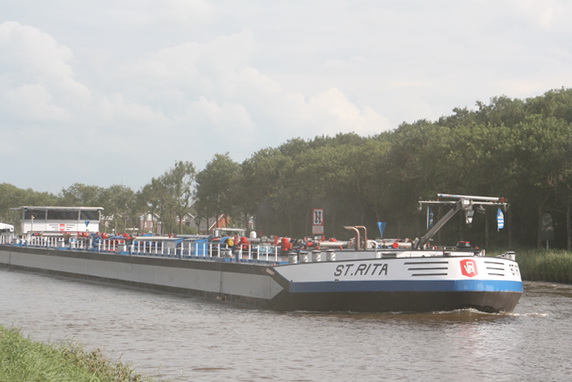 Rechts van me wordt het kanaal bevaren door de ‘St. Rita’, een van de grotere binnenvaarders, bijna 3000 ton. Het lijkt nevelig, maar vergis u niet, het is “stof”, opwolkend vanaf de kanaalweg waar intensief grondverkeer plaats vindt.
