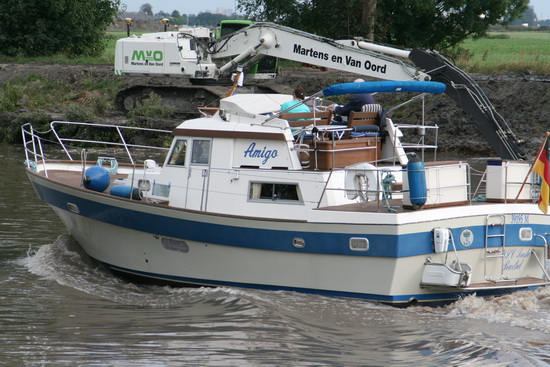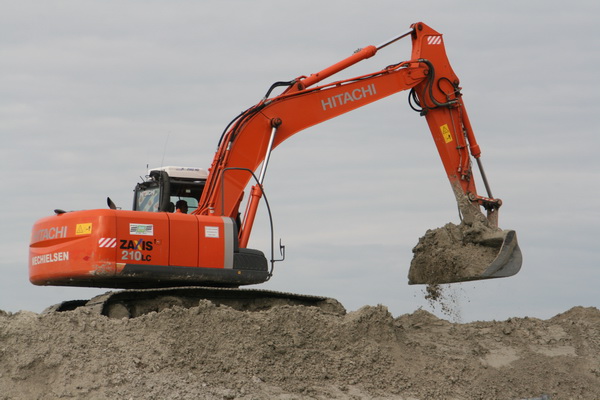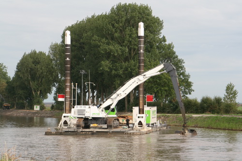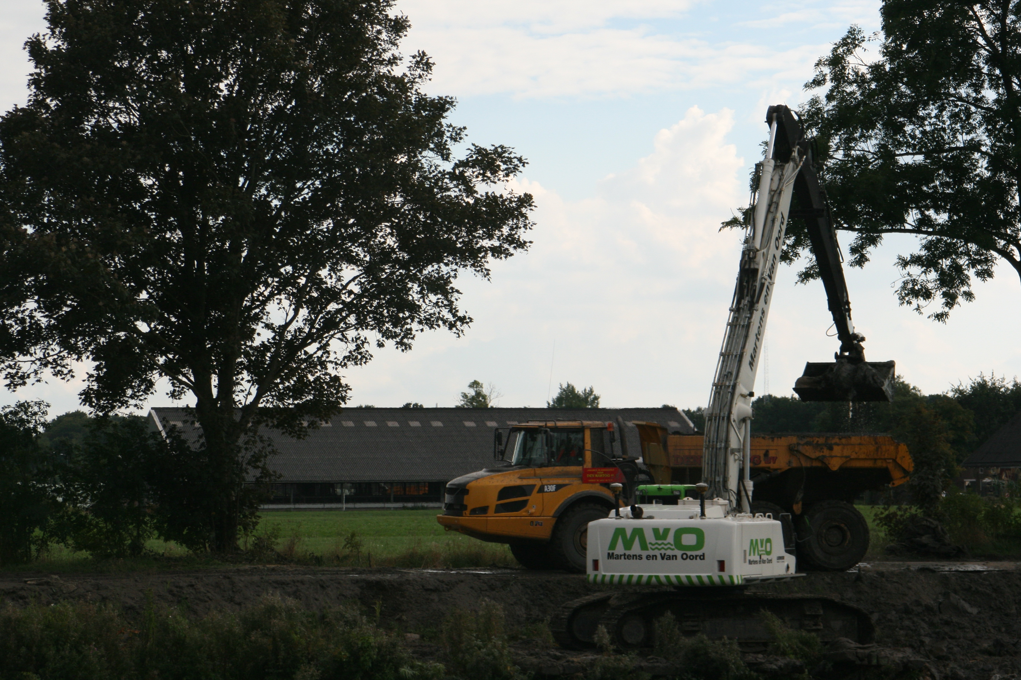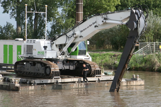 Zo, de ponton is een eindje opgeschoven. Op de achtergrond de kraan aan de wal die telkens happen neemt van de zuidelijke oever. En deze happen worden op ‘jentige’ vrachtwagens gedeponeerd om naar het gebied bij de nieuwe weg (deel N355) te worden gebracht.