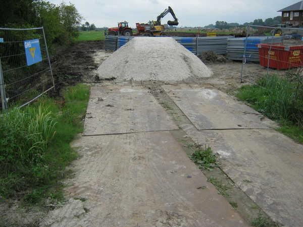 Hier zijn in het weekeinde rioleringsbuizen geplaatst. De weg is tijdelijk weer berijdbaar gemaakt door betonnen platen in het wegdek te plaatsen.