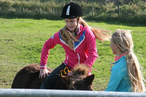 Dat bestijgen valt trouwens nog niet mee, in het begin. “Je kunt het!” moedigt het andere meisje aan!