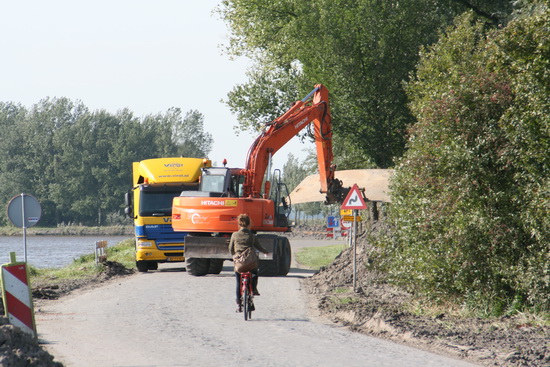 De draglinebestuurder vindt het welletjes. Hij plaatst de verkeersborden weer op de goede plek: Werk in Uitvoering en Maximaal 30 km. Mooi zo!