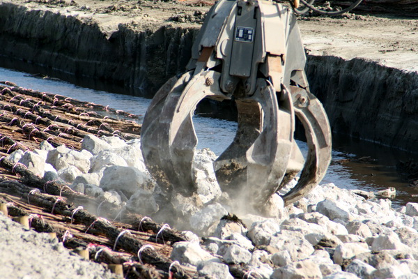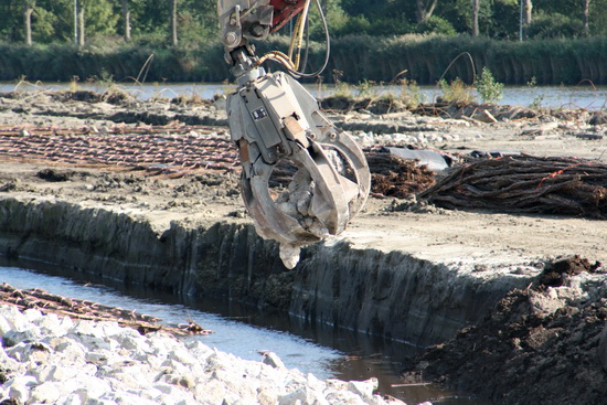 Doorlopen richting spoorbrug. Daar is een grijper gestaag bezig de brokken steen op de nieuwe oeverkant te deponeren.