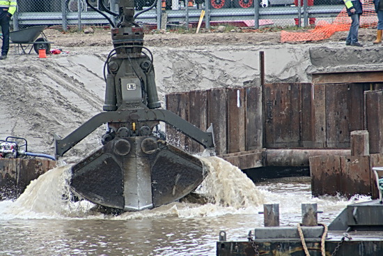 Intussen drukt de grijpermachinist het hele werkeiland met behulp van zijn grijperschep naar een iets andere plaats… (Is mijn interpretatie….)