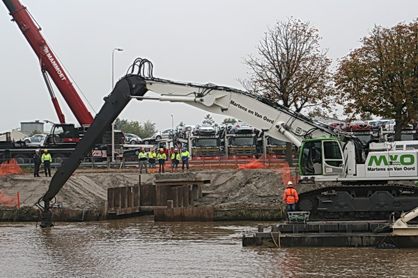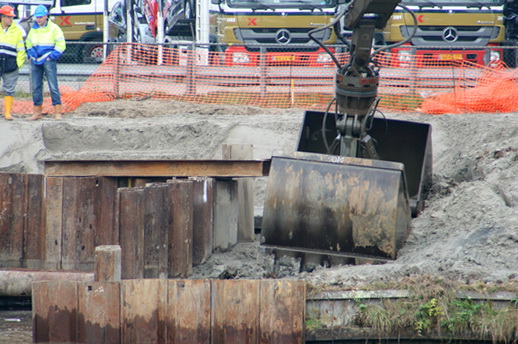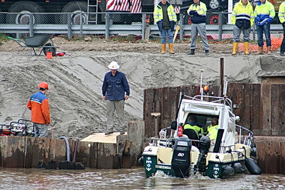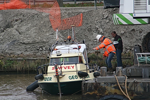 De Geo Spider met het peilteam komt een kijken nemen bij het noordelijke sleufeinde. Zouden ze nu tot een positief advies komen wat betreft de verzinking?